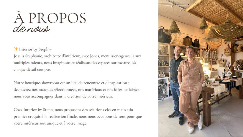 Un duo d'experts locaux : Stéphanie, architecte d'intérieur avec 10 ans d'expérience, et Jonas, menuisier-agenceur talentueux. Ensemble, ils créent un environnement unique qui valorise votre bien, que ce soit pour vous ou pour la location.